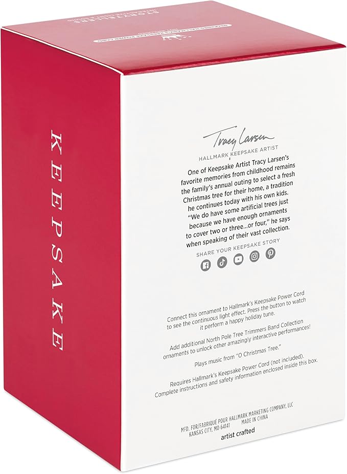 - Connect the Storytellers Interactive Light and Sound ornament to Hallmark's Keepsake Power Cord (sold separately) to see a continuous light effect. Press the button to watch it perform a happy holiday tune. Add other North Pole Tree Trimmers Band Collection ornaments to unlock additional amazingly interactive performances. Ornament plays a fun version of "O Christmas Tree."