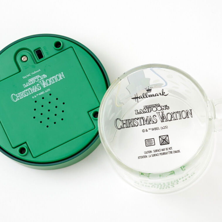 Let your holiday spirit soar to rooftop heights with this Clark Griswold Christmas mug that's brimming with over-the-top cheer. The clear glass cup features an illustration of Clark holding electrical cords with a collage of Christmas lights surrounding him and a fun Clark quote on back. Set the mug on the green base, included, to see the mug glow with light and hear zapping sounds and music from "National Lampoon's Christmas Vacation." This funny mug makes a great gift choice for fans of the hilarious holiday movie.
